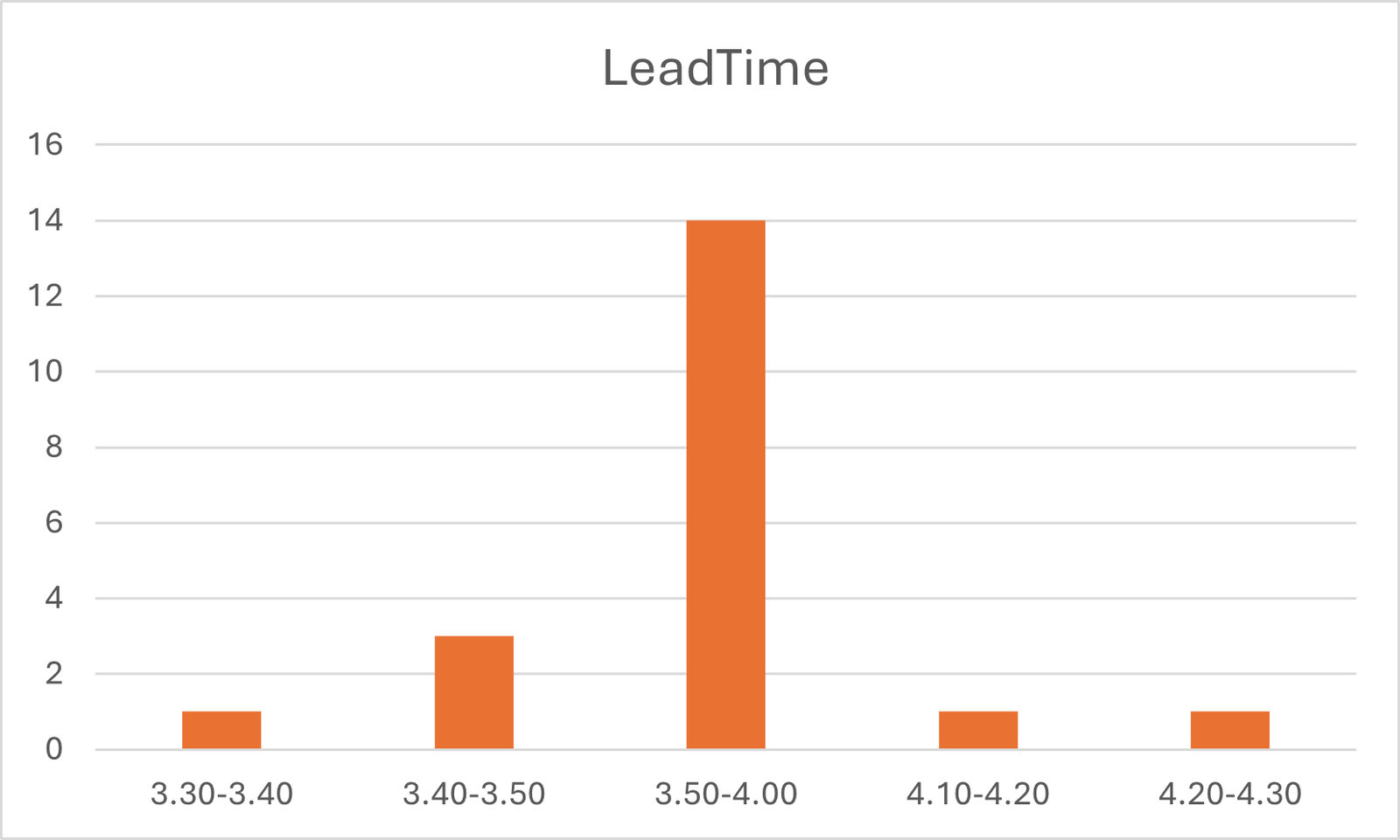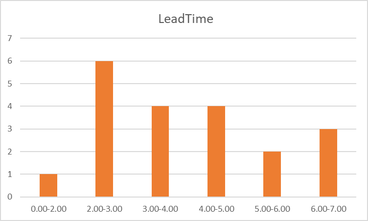 Si representamos en un histograma de frecuencias del Lead-time (012) y obtenemos la Figura 3.3. representa claramente una  la falta de control del proceso, no hay repetibilidad en el valor del lead-time. Hay necesidad de mejora en este aspecto para poder facilitar un servicio adecuado a los clientes.